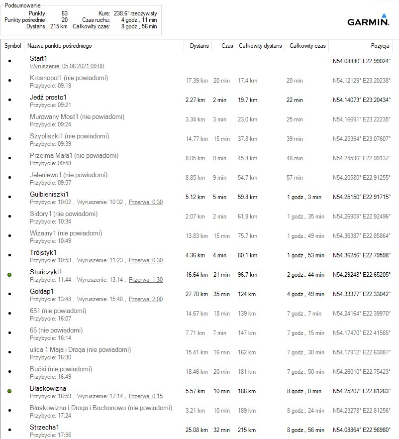 Sumaryczna długość trasy 215 km, 9 h podróży (9.00 – 18.00).