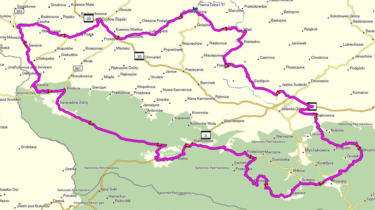 Trasę zaczynamy na Przedgórzu, przecinamy północną część Gór Izerskich tak aby od zachodu wjechać w Karkonosze.